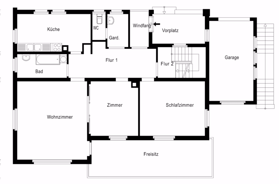 Im Gartengeschoss befindet sich ein vollständig modernisierter Wohnbereich mit eigenem Wohnzimmer, Schlafzimmer, Küche sowie einem neu sanierten Badezimmer mit bodengleicher Dusche. Diese Ebene eignet sich hervorragend als Einliegerwohnung – sowohl zur Vermietung als auch zur Nutzung innerhalb der Familie. Ein Zugang ist sowohl intern, als über Außen (links der Garage) möglich.