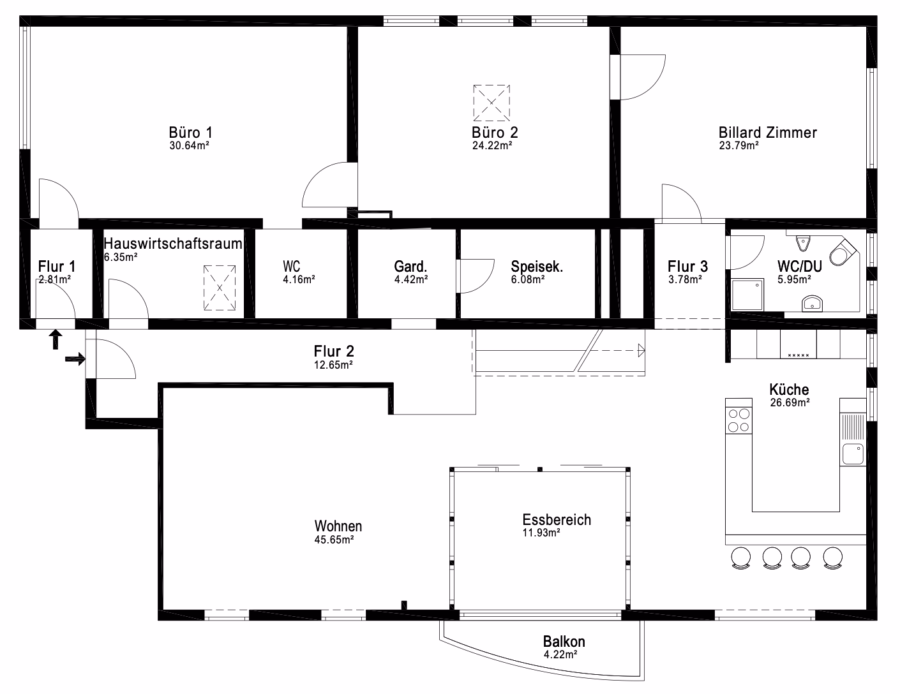 Eine Besonderheit dieser Immobilie ist der separat nutzbare Bürotrakt, der sich direkt an das Billardzimmer anschließt. Zwei großzügige Büroräume sowie ein eigenes Gäste-WC stehen hier zur Verfügung. Dank eines zusätzlichen Eingangs über das Treppenhaus lässt sich dieser Bereich bei Bedarf vollkommen autark nutzen, was ideal für eine berufliche Nutzung ist. Alternativ besteht auch die Möglichkeit, diesen Bereich baulich als eigenständige Wohneinheit abzutrennen und bspw. separat zu vermieten.