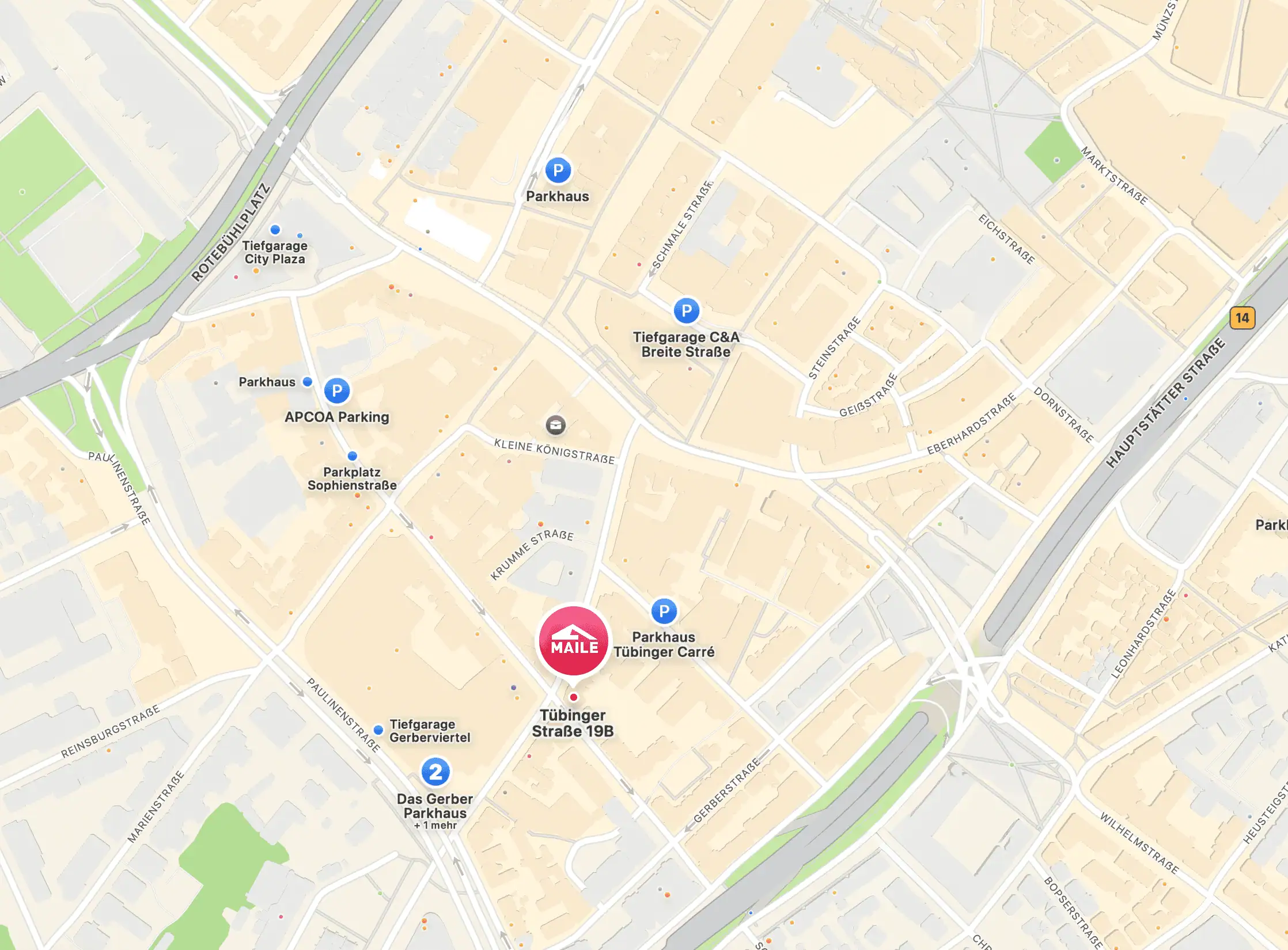 Kommen Sie vom Rotebühlplatz, gehen Sie die Tübinger Straße direkt entlang, bis Sie auf Höhe des Einkaufszentrums Gerber sind. Das Gebäude liegt auf der linken Straßenseite.